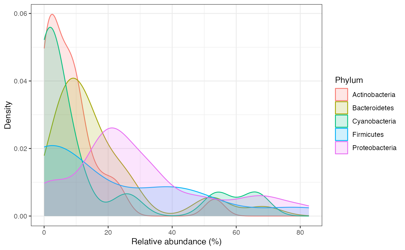 plot_abundance_density(global_patterns, taxonomic_rank = "Phylum", top_n = 5)