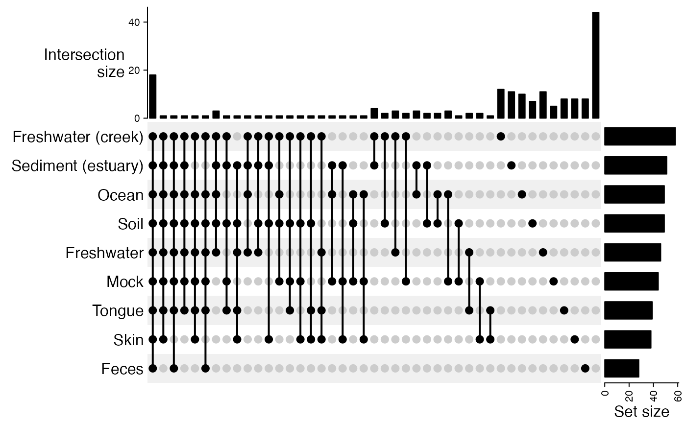 plot_prevalence_upset(global_patterns, group_by = "SampleType", taxonomic_rank = "Phylum")