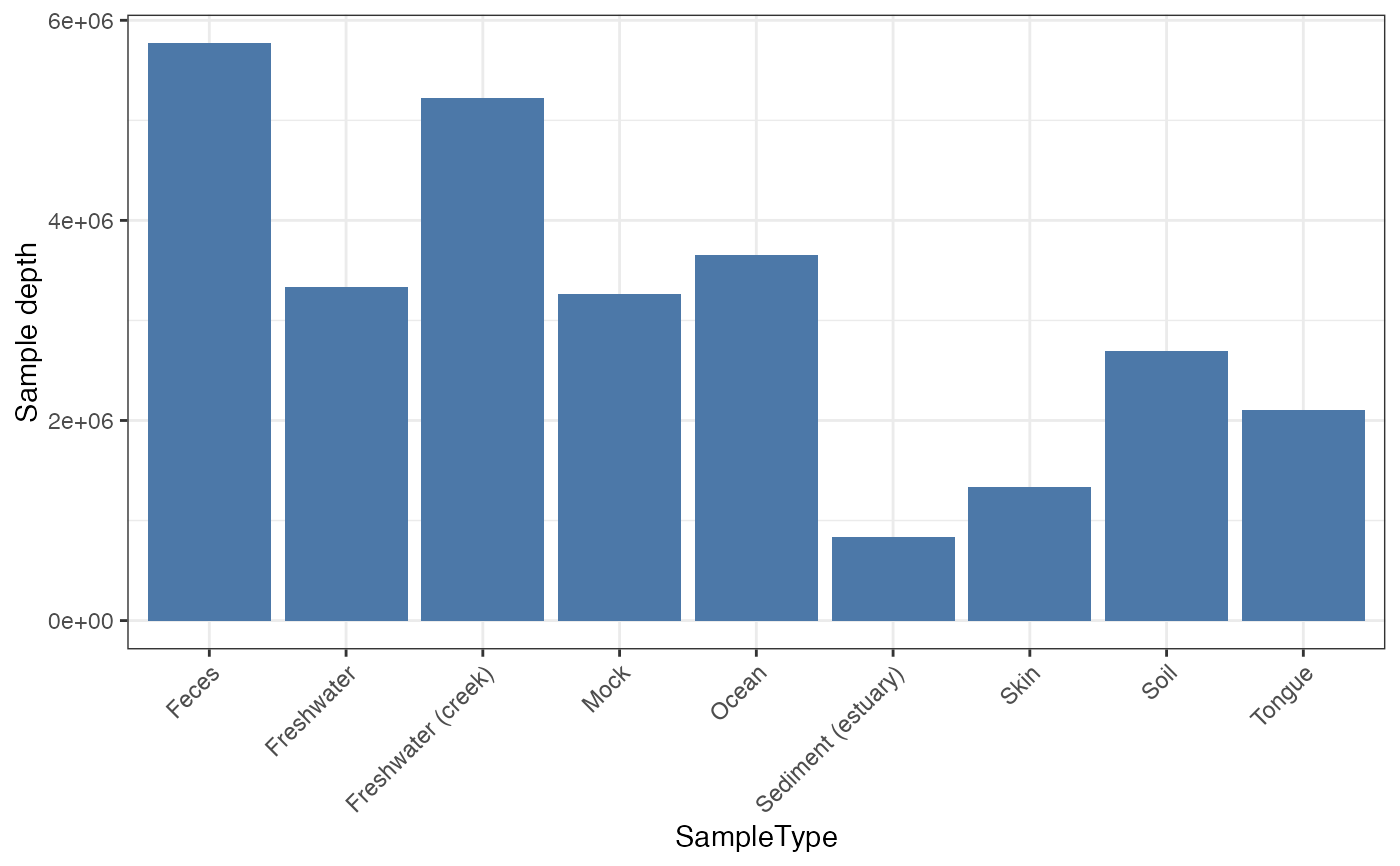 data("global_patterns", package = "microbiomedataset") plot_sample_depth(global_patterns, x = "SampleType")
